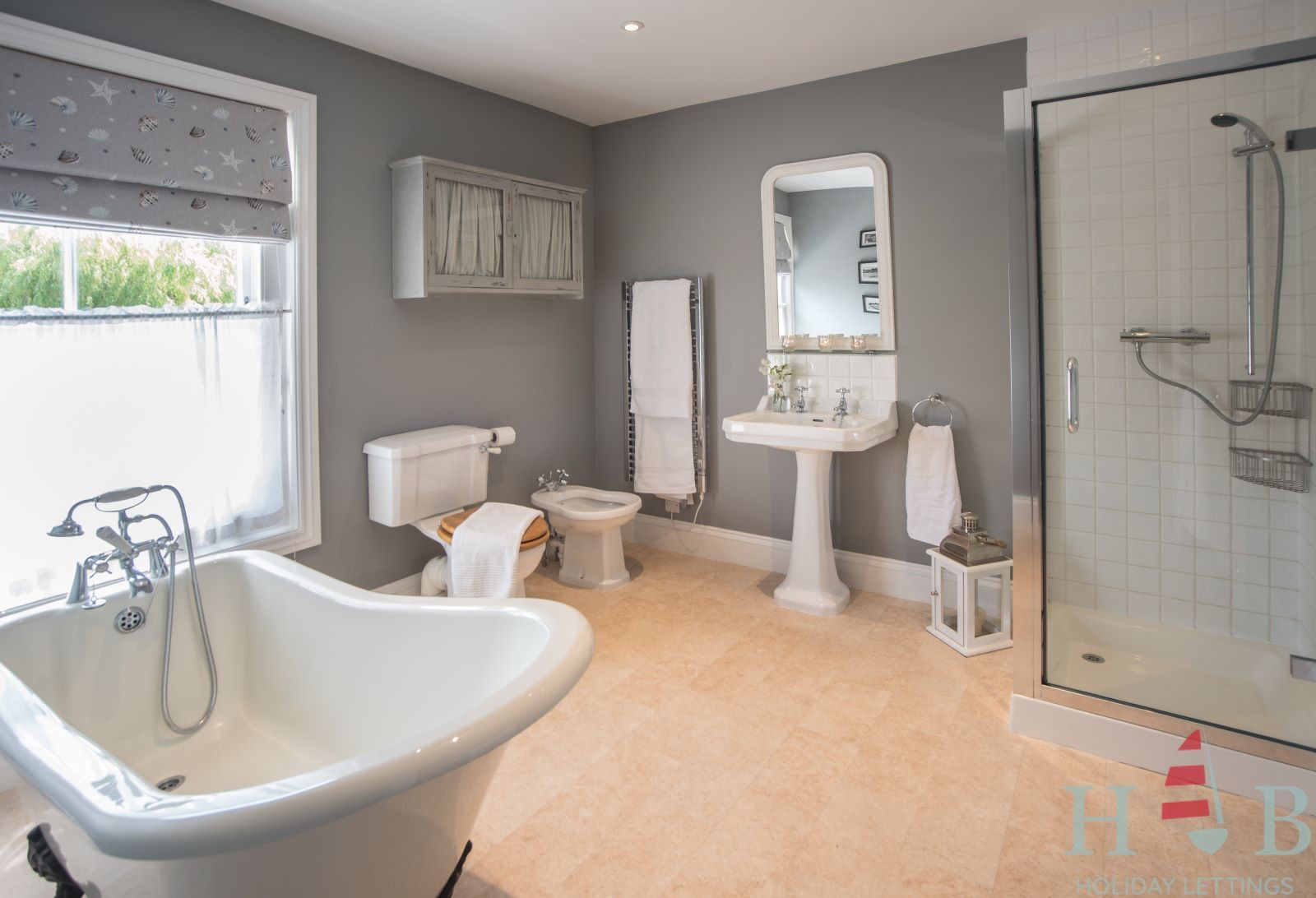 Family bathroom with walk in shower, roll top bath, bidet, WC and WHB.