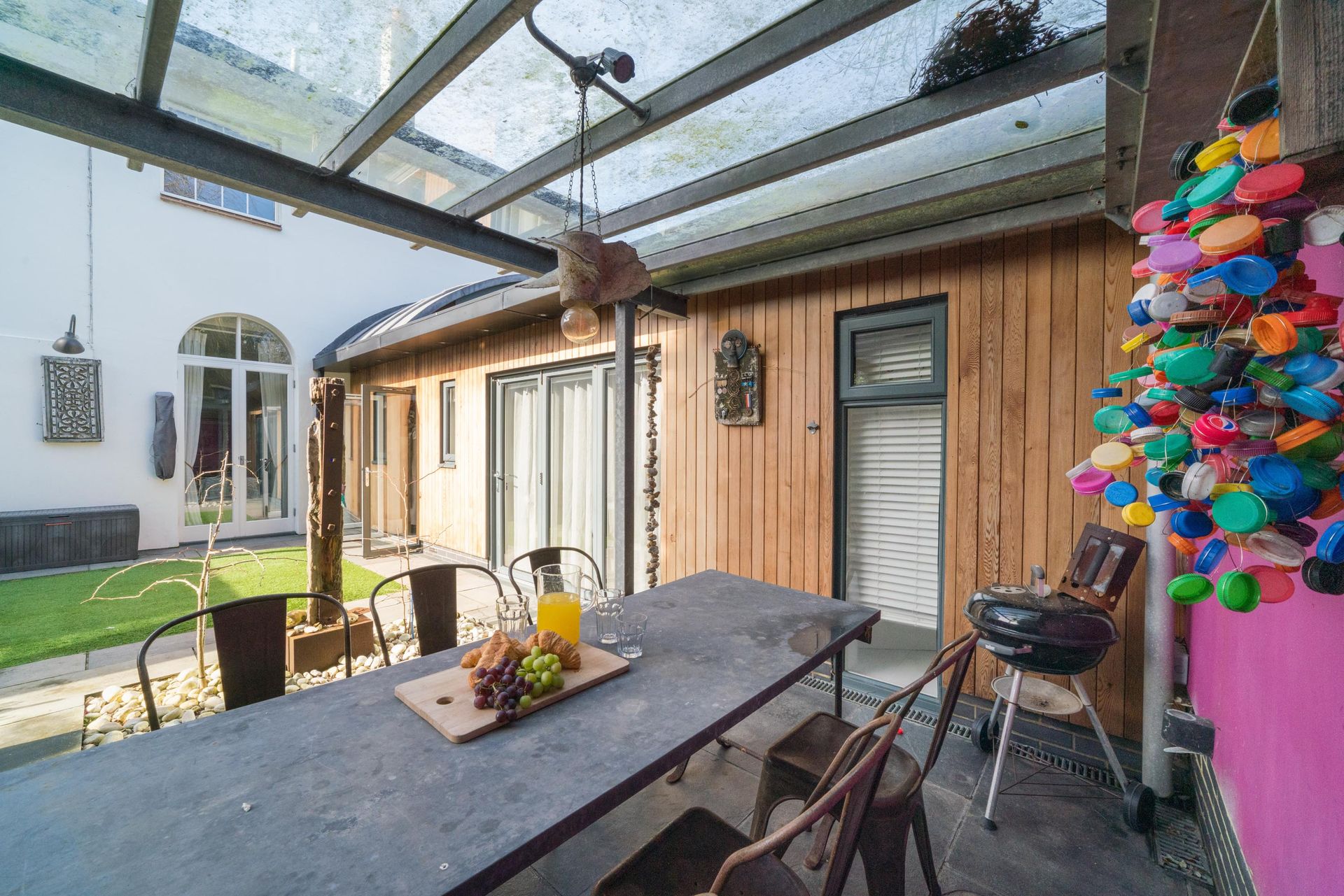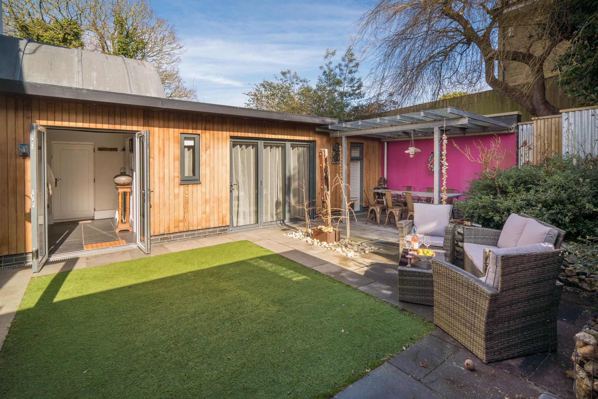 The bright en suite master bedroom features sliding doors that lead to the private enclosed garden, allowing guests to enjoy the outdoors in peace. The hallway offers access to the garden and leads into the large, comfortable living room, perfect for unwinding after a day of exploring. The kitchen is fully equipped and features a dining area with seating for 6 guests, and doors leading directly to the garden, ideal for outdoor meals.