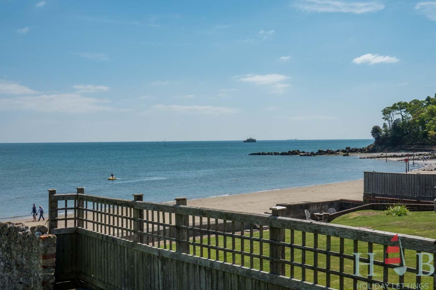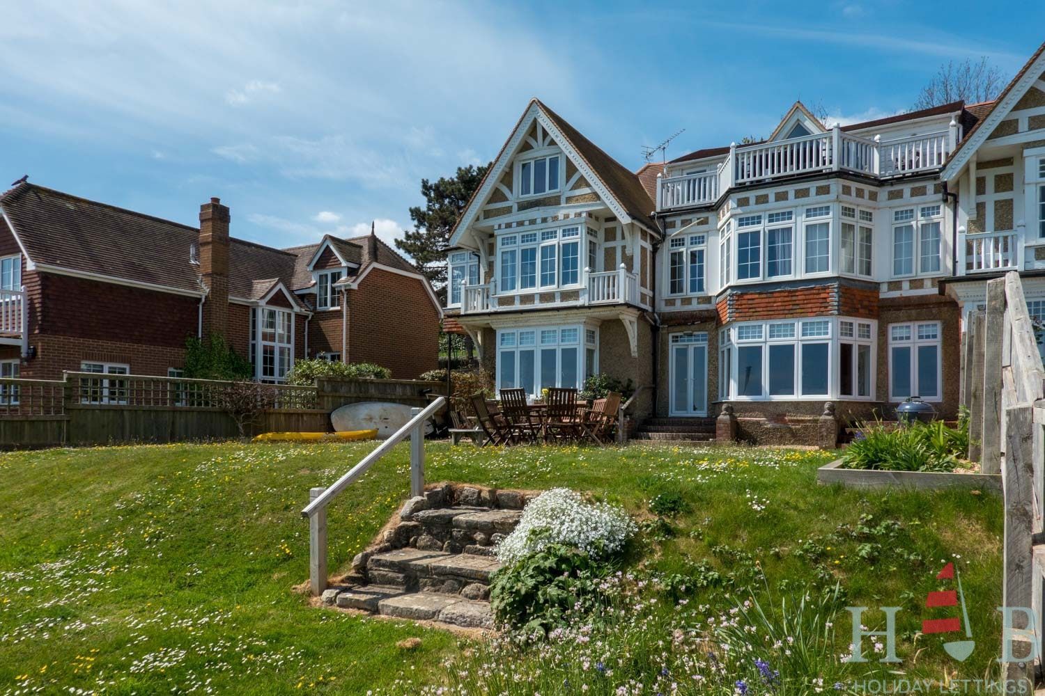 Large, lawned garden running down to the beach.