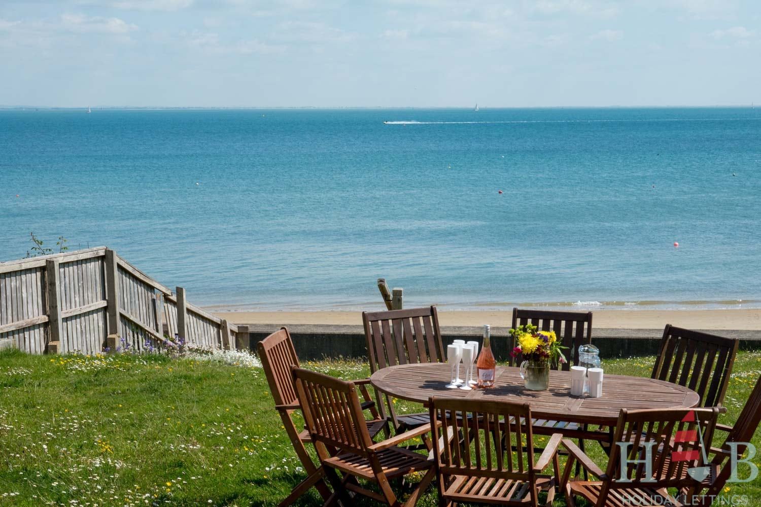 A large open plan living and dining area boasts panoramic views across the lawn to the bay and double doors to the outside. Comfortable sofas and a window seat are arranged to enjoy the ever changing seascape and the dining table seats 8. The master bedroom enjoys the same wonderful views with a superking size bed and en suite shower room. The newly decorated bunk room sleeping four is at the back of the apartment, as is the family bathroom with bath and separate shower. There is another good-sized double bedroom on that side of the flat. The kitchen is well equipped and has another door to the outside. Parking is available on the lane in front of the property. The attractive and friendly village of Seaview with its shops and restaurants is a short stroll down Pier Road. Footpaths from the front of the property also lead to the beautiful and quiet Priory Bay.
