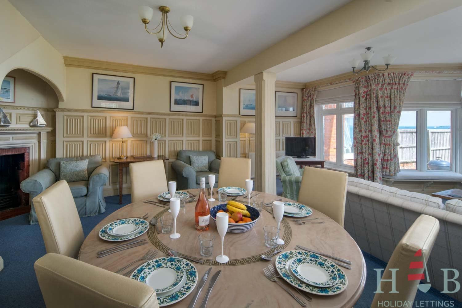 Large living room, sofas, armchairs and window seat