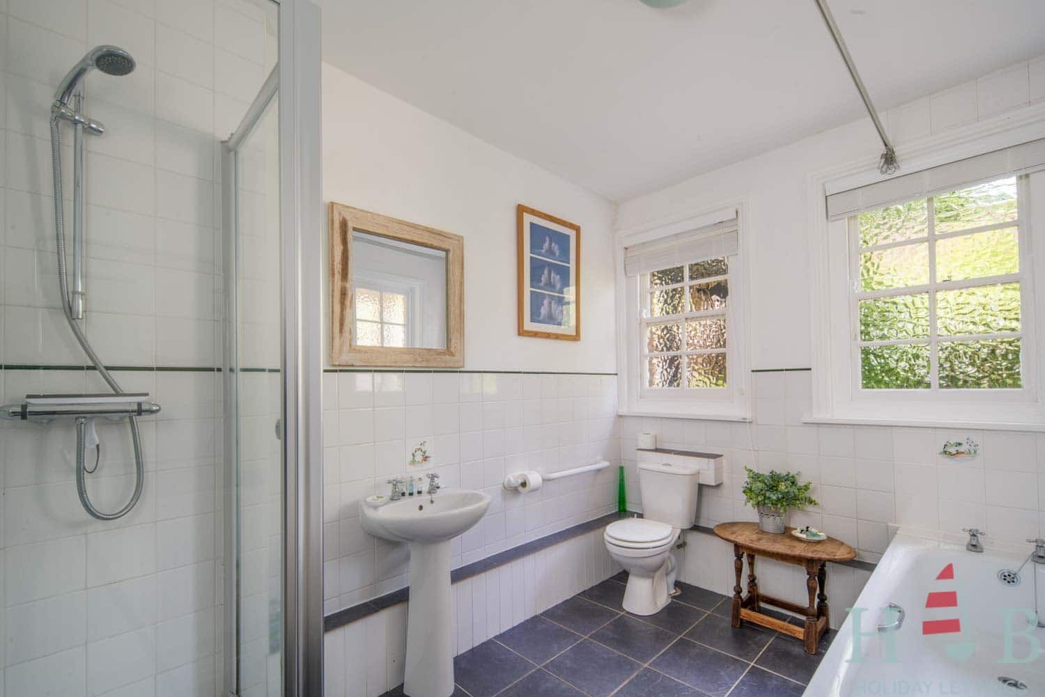 Family bathroom with bath, shower over, WC basin and separate walk in shower