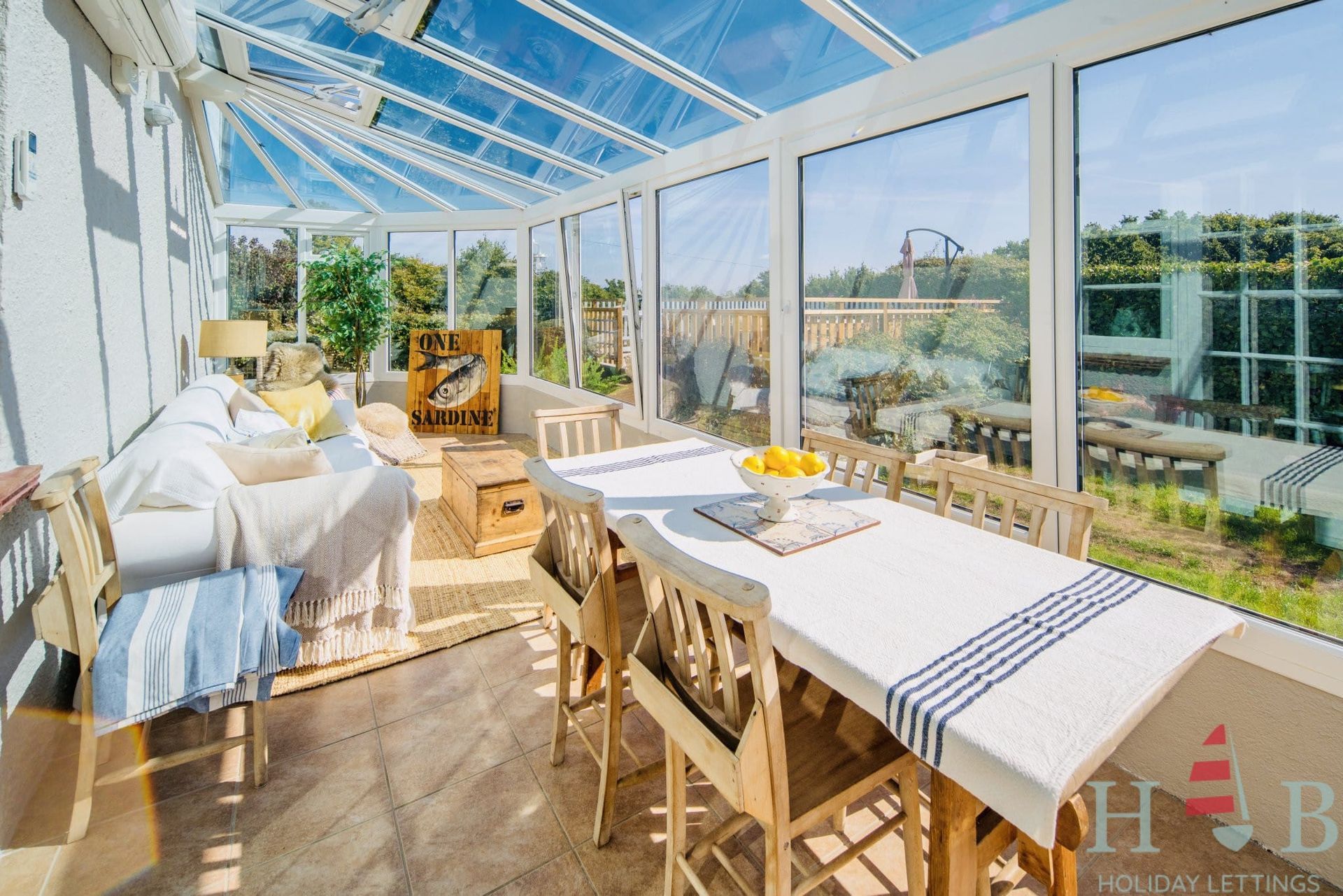Garden room with large sofa, wicker chaise, armchair and games chest. Dining table and chairs for 6.