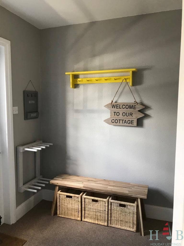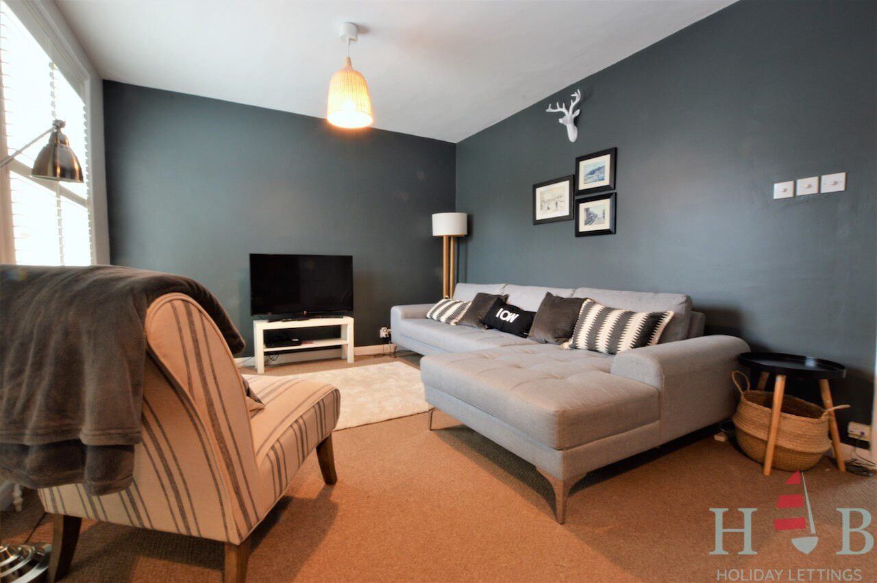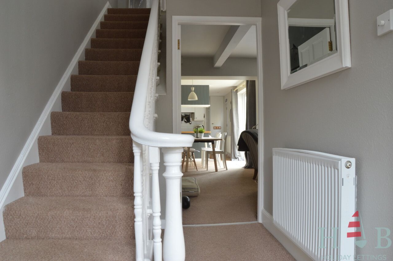 Walk in to the cottage to wide hall and space for hanging jackets etc. Staircase and hall ahead with twin bedroom to the right. Along hall to open plan ‘L’ shaped living room with large sofa and TV. Through to the kitchen with dining table, chairs and the kitchen. There is then the downstairs shower room with WC. From the kitchen/diner there are sliding doors out to the patio garden with garden furniture and BBQ. Upstairs, 2 good size king bedrooms with side tables, lamps, chest of drawers and hanging space, 1 shower room with WC and further separate WC. Freshly painted throughout – perfect for friends and family.