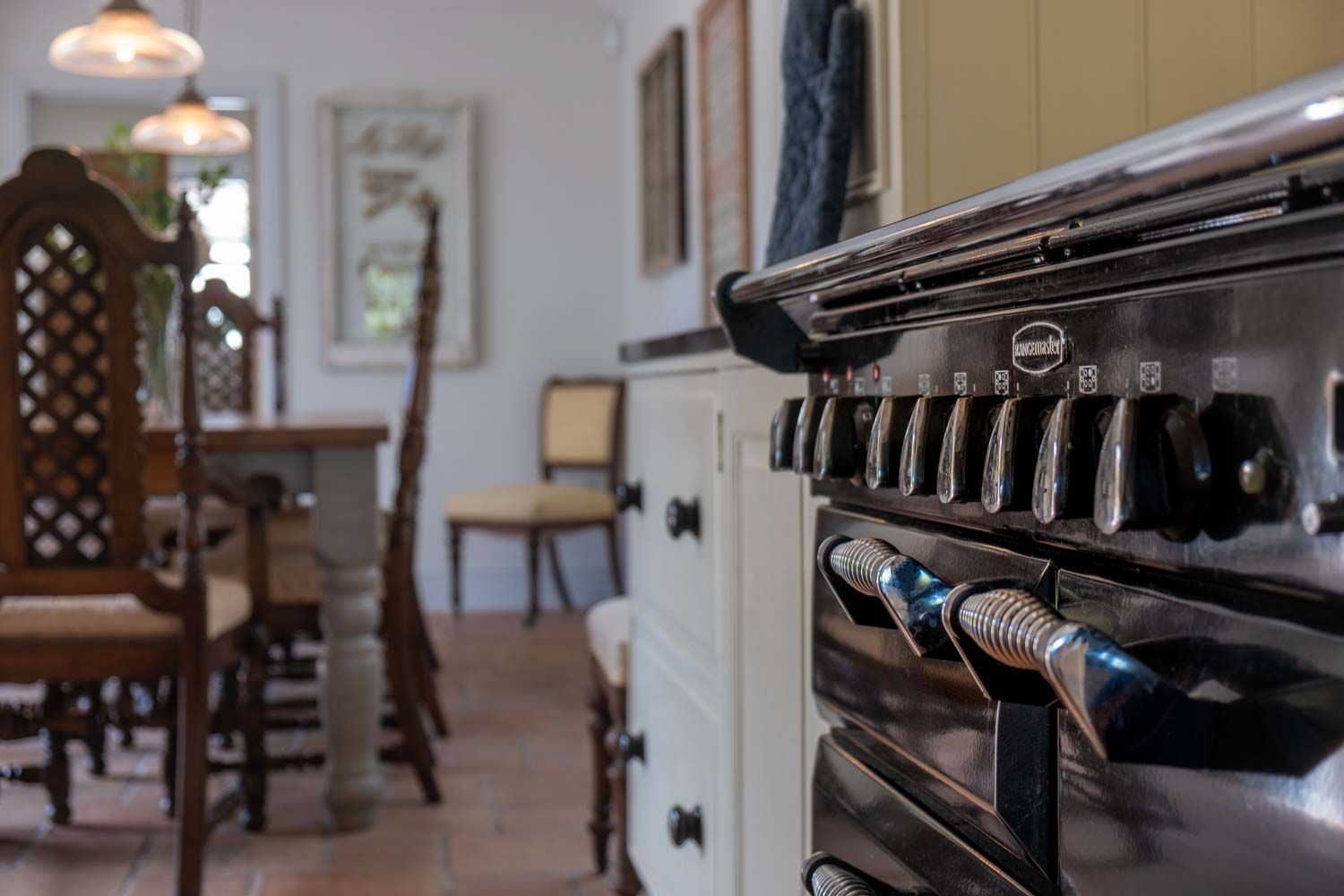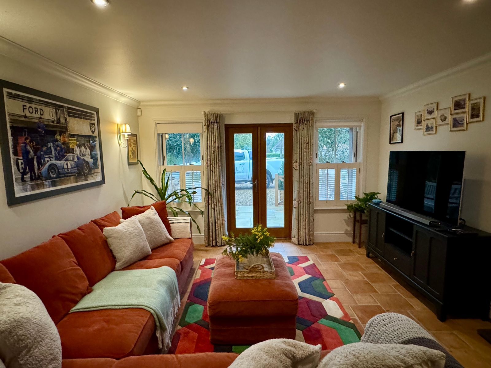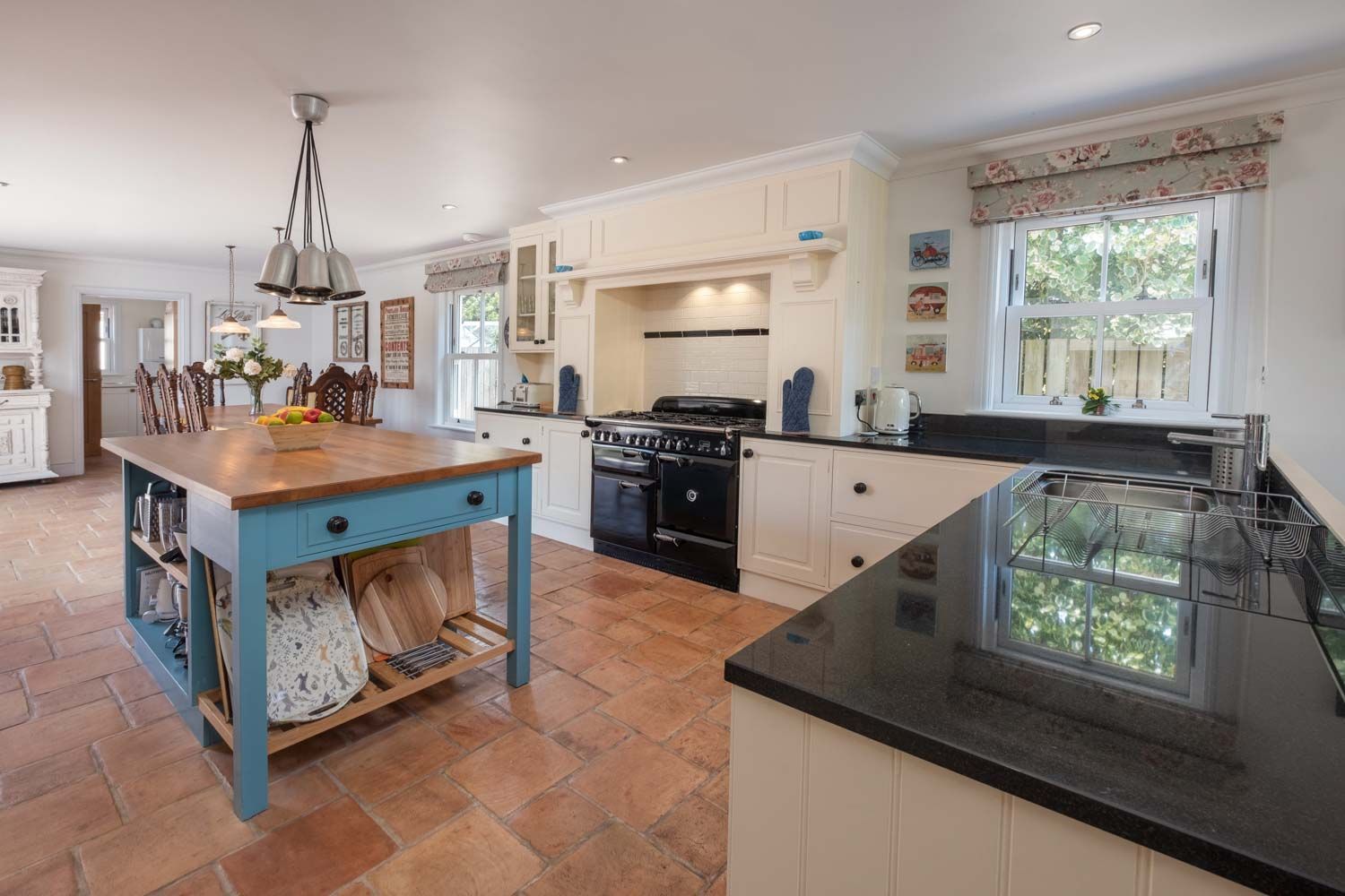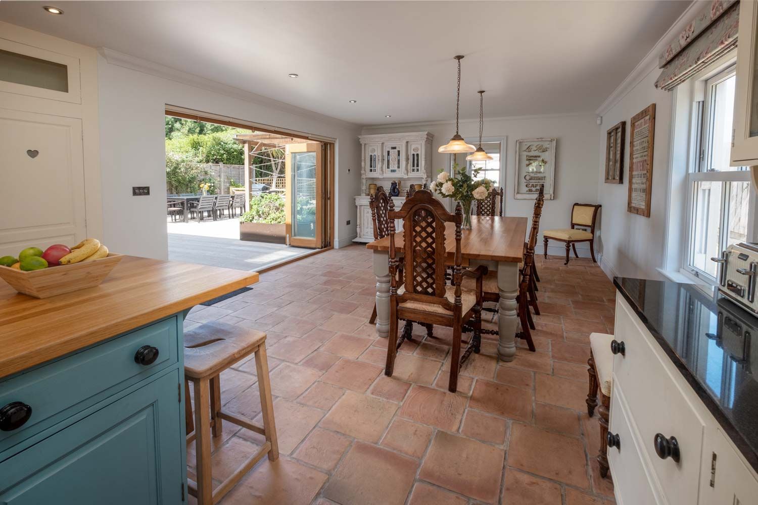 Fully Equipped Modern Kitchen: The well-appointed kitchen is equipped with modern appliances and plenty of counter space for preparation. The open-plan design flows seamlessly from a living area with TV down through the kitchen and in to the dining area where bi-folding doors open out onto a charming terrace leading on to the garden.