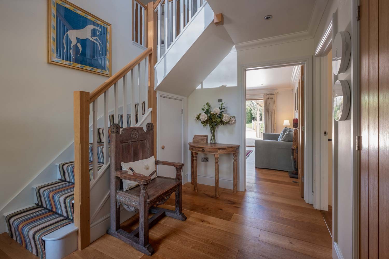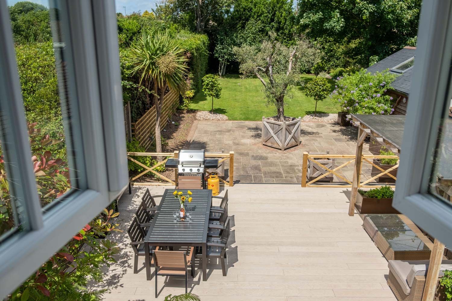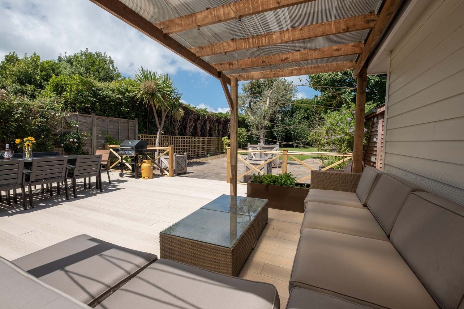 Welcoming Hallway : stairs lead up to the 5 bedrooms : to the right is the open plan kitchen, ahead is the living room with plenty of seating and bi-folding doors out to the terrace and on to the garden. Whether you're enjoying an alfresco meal, relaxing with a drink, or simply soaking up the fresh air, this outdoor space is perfect for making the most of the island's mild climate.