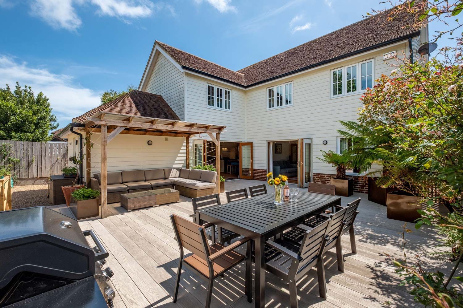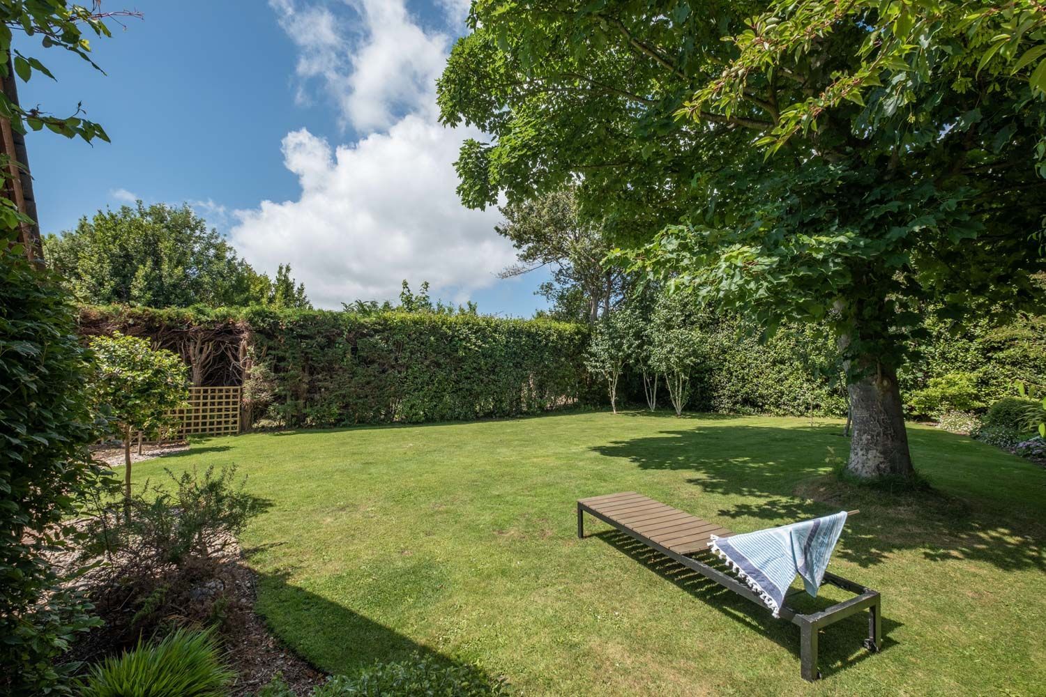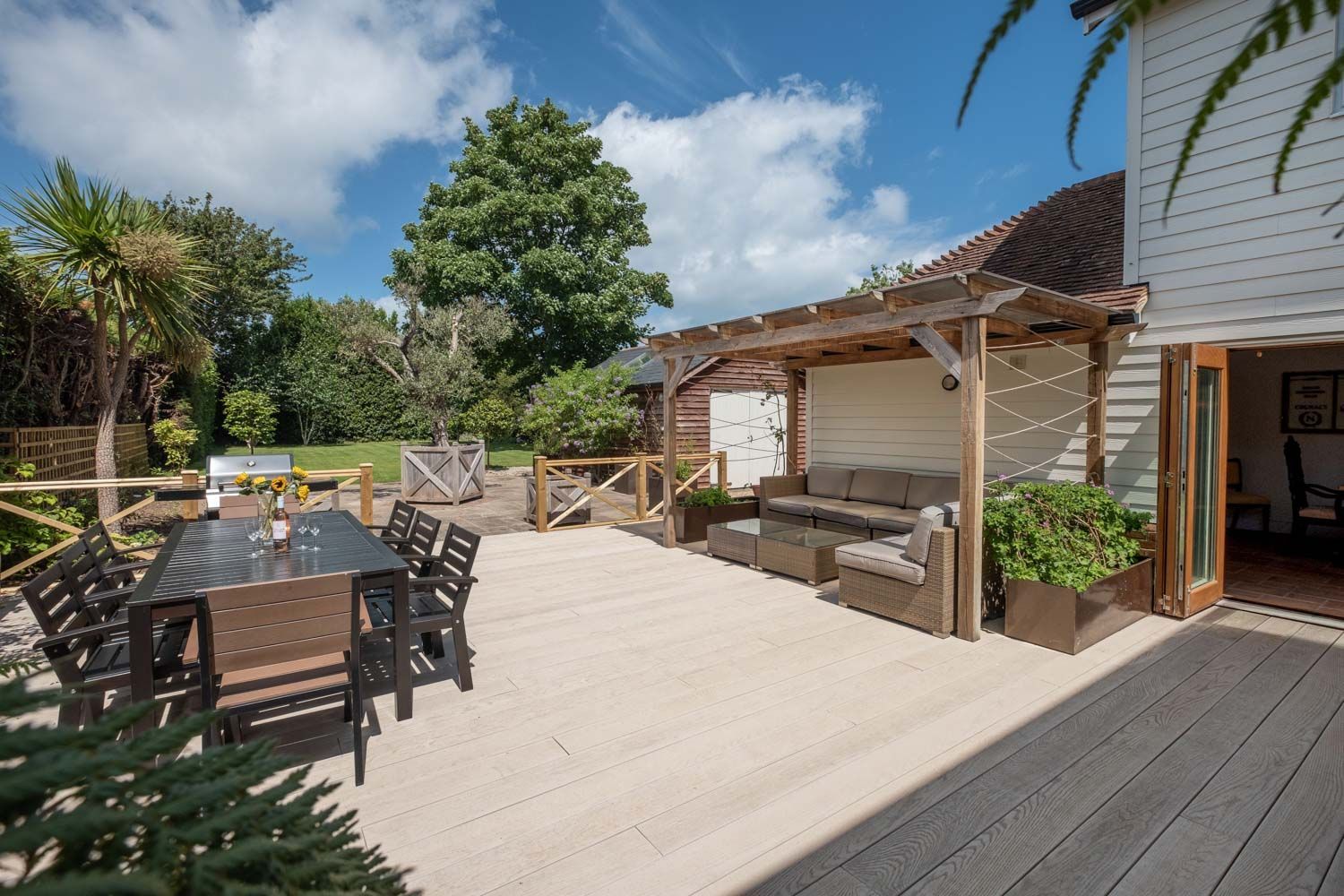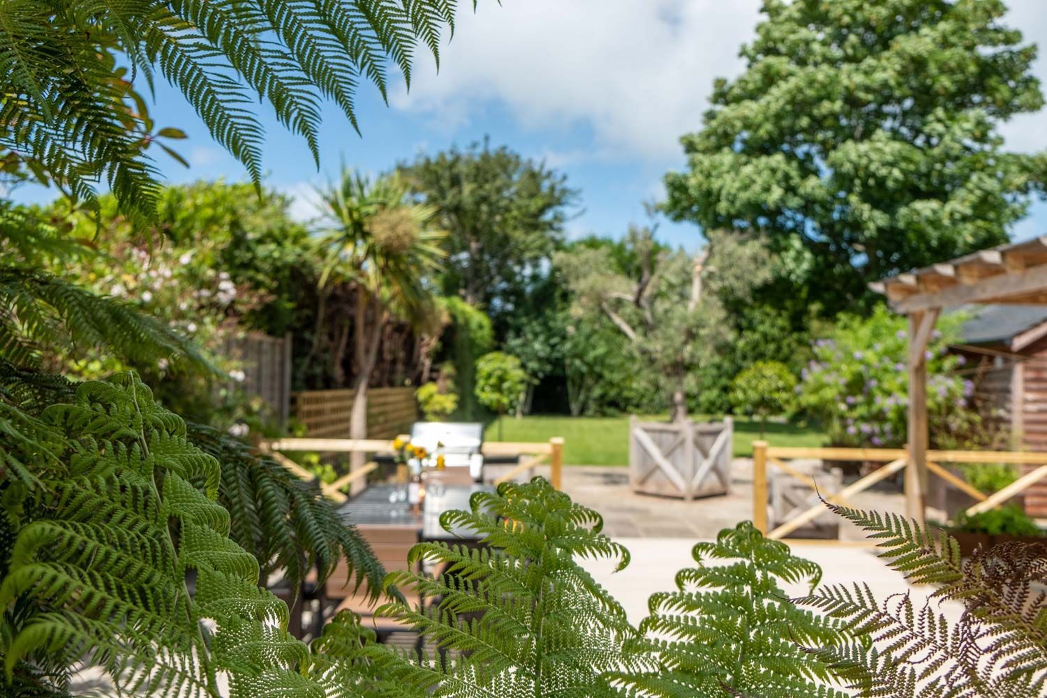 Welcoming Hallway : stairs lead up to the 5 bedrooms : to the right is the open plan kitchen, ahead is the living room with plenty of seating and bi-folding doors out to the terrace and on to the garden. Whether you're enjoying an alfresco meal, relaxing with a drink, or simply soaking up the fresh air, this outdoor space is perfect for making the most of the island's mild climate.