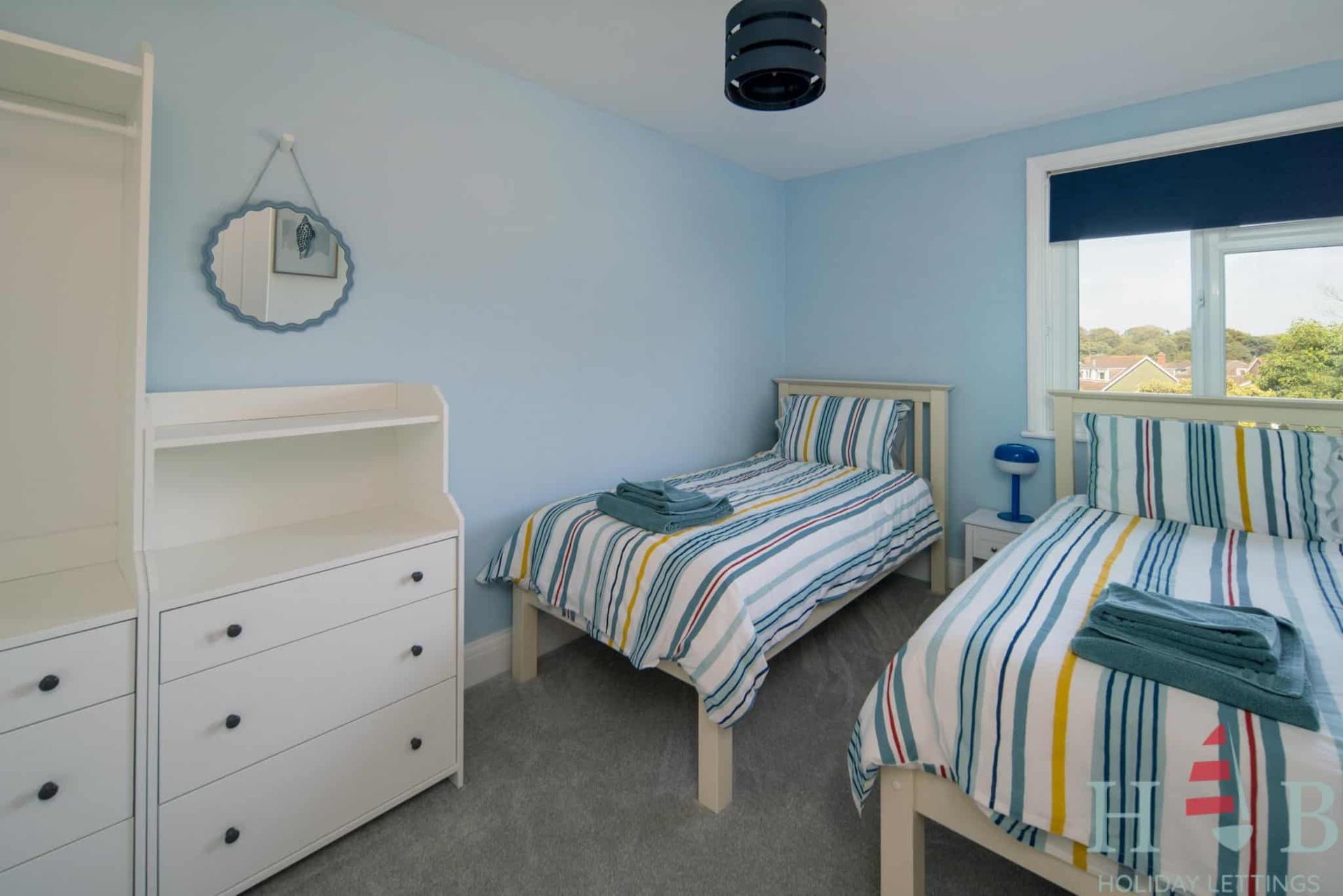 Twin bedroom with wardrobes/chest of drawers, bed side tables